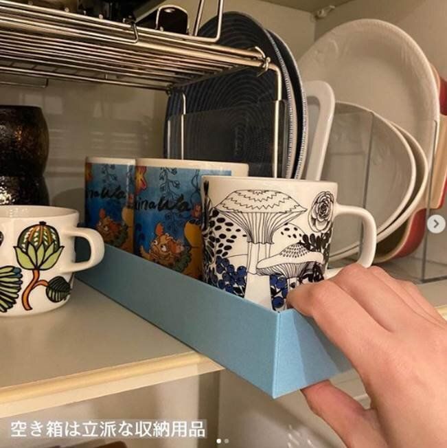 収納スペースにぴったりの空き箱があれば、それは立派な収納用品です。こちらの空き箱はマグカップにぴったり!引き出して取ることができるので奥に並べても取りだしやすいですね。空き箱なので、汚れたらまた取りかえればいいというのもお手軽です。