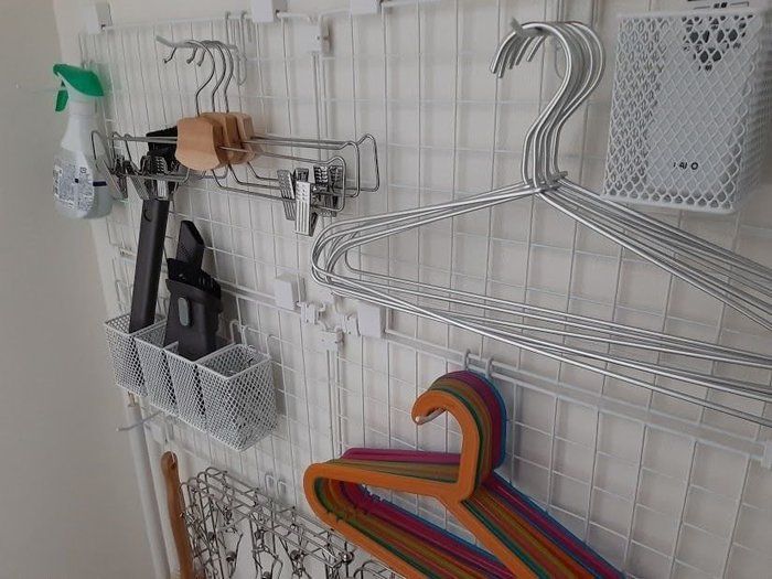 洗濯物を干す際に大活躍のハンガーも、使わないときは意外とかさばってしまい収納に困るアイテムのひとつ。miokoさんは、100均で売られているワイヤーネットとパーツを使い、独自の壁面収納をつくったんだそう。洗濯物を干す場所の近くに設置しておけば、よりスムーズにお洗濯を進められそうですね。