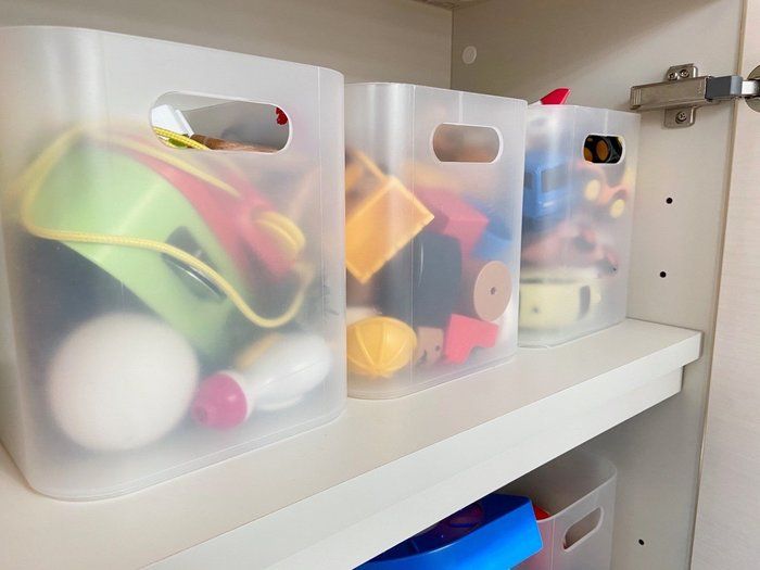 小さな子どものこまやかなおもちゃの収納にはダイソーの積み重ねボックスを利用しています。透けているので中身が見やすく、取り出しやすいのが特徴。手を入れる穴があるので、出したり戻したりして簡単に収納することができるようです。