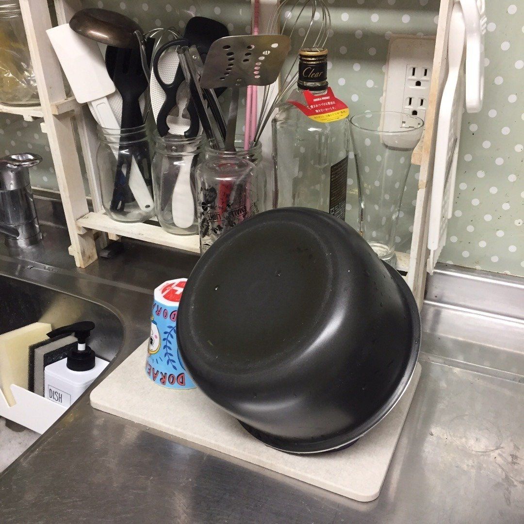 スペースを大きくとっていた水切りかごをやめて、珪藻土マットを導入したまるやま ひろこさん。使わないときは立てかけて乾かしておけるので、手入れもらくなのだとか。水切りかごや吸水ふきんに置くよりも乾きが早いので、衛生面を気にすることなく洗いものができるのも、うれしいところ。