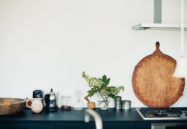 必要な道具と花びんはキッチン台に置くけれど、手を伸ばせばすぐ届く範囲に限定。「高い場所に物をつるしたり飾ったりするとほこりがたまりやすいので、置くのは平面のみにしています」。右の木製ボードはパンの生地をこねる台で、古道具屋で一目ぼれして購入。ガス台の油はねをよける役目も担っている。