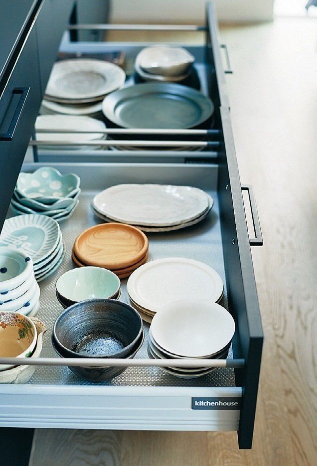 持ち物は大切にしつつ、とことん使い倒すのが桂さんのポリシー。食器も同様で、引き出し内の食器は全部1軍としてフル稼働。「2軍はないから、この引き出しだけで充分」。枚数が少なければしまうのはもちろん洗うのもラク。