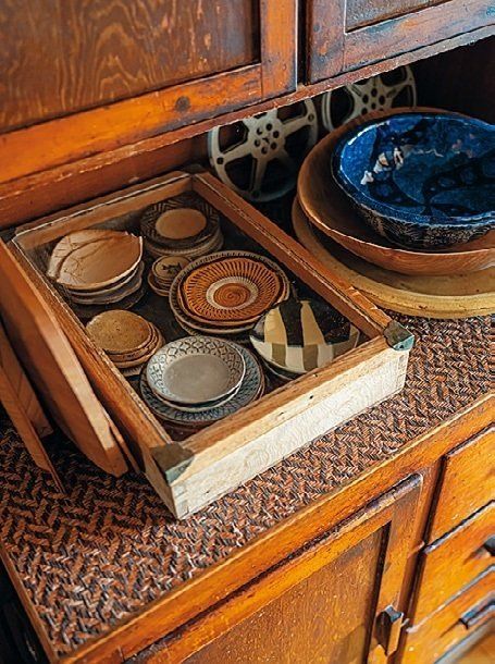 例えば、いつも眺めていたい、大好きなアルミ製のレモン絞り器。年に数回しか使わないのに、手が届きやすい、いわゆる〝1軍〞を収納するための場所に引っ掛けています。たくさん持っている、日々よく使う豆皿は、ガラスぶたの箱の中から毎日出し入れ。わざわざ両手でふたを開ける必要があるので、ひと手間かかりますが、好きで集めている器をワクワクする気持ちで眺められるからというのが理由です。