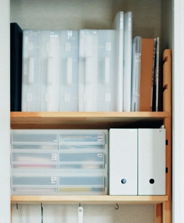 家の重要書類や何度も見返すプリント、鍵などは物置の上段に。「万一私が入院したりしても家族が困らないよう、ボックスや引き出しの中に何が入っているかをラベリングしています」。棚はホームセンターで木材を買い、自作!