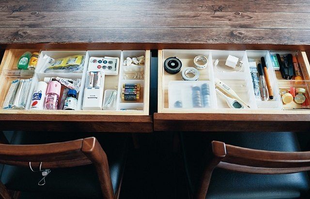 本来はカトラリー収納の引き出しだけど、スマホの充電器や薬、子どもの集金に使う小銭など、毎日使う物だけをキュッとまとめて収納。「この引き出しのおかげで、夫の物の出しっ放しと、『あれどこ?』と聞かれるストレスがなくなりました」