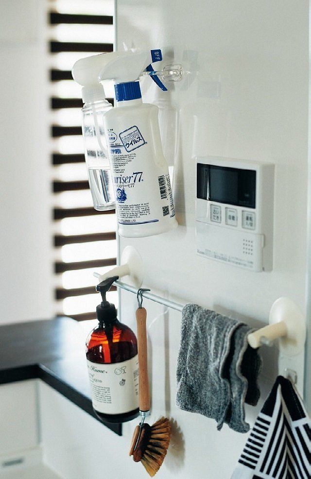 スプレーやソープのボトルは、直接置くと接地面がヌメって不衛生だし掃除が面倒。だから壁に無印良品のバーやセリアのフックをつけてつるして。こうすればシンクの掃除がラクに。