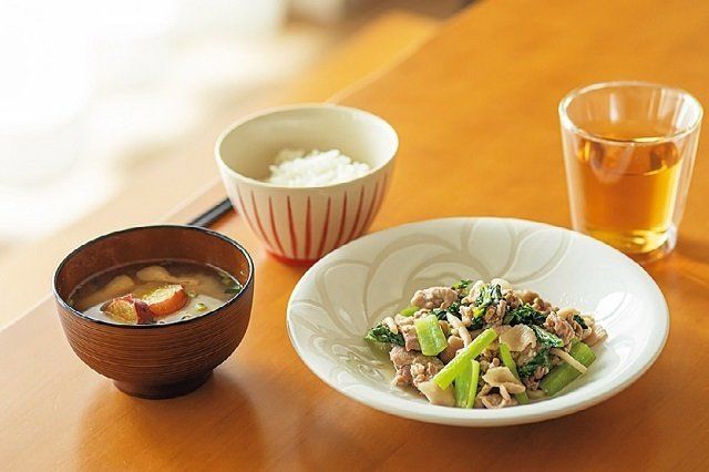 喜んで完食してもらうのがいちばんだから、みそ汁の具は、息子が好きなさつまいもと夫が好きな貝を交互に。「おかずは、冷蔵庫内の野菜+解凍した豚肉や鶏肉の炒めものが定番。これなら栄養バランスもいいし、平日の夕食はこれでよしとしました」