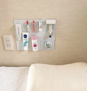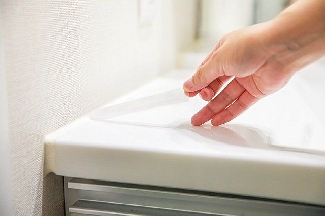 洗面台と壁の境目にうっすらホコリがたまるのがイヤ。でも小まめに掃除なんかできない。「なので、半透明のテープを一直線に貼りました。月1で貼り替えるだけで、きれいがキープできます」