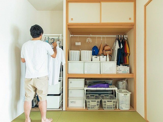 タオルと下着以外の乾燥後の服は、押し入れに入っている3つのカゴに放り込む。ほぼたたまなくてOK。
