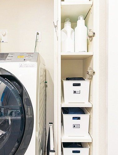下着は洗濯乾燥機横のカゴに人別収納。元々ついていた扉は撤去。