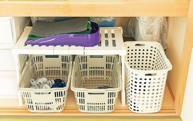 yuuko_homeさんの洗濯の流れは、たたむ&しまう手間が大幅にカットされています。衣類の乾燥が終わったら、まずタオルなどの大物を出し、軽く丸めて上のカゴにポン。引き出しなどにしまわなくていいからラク。