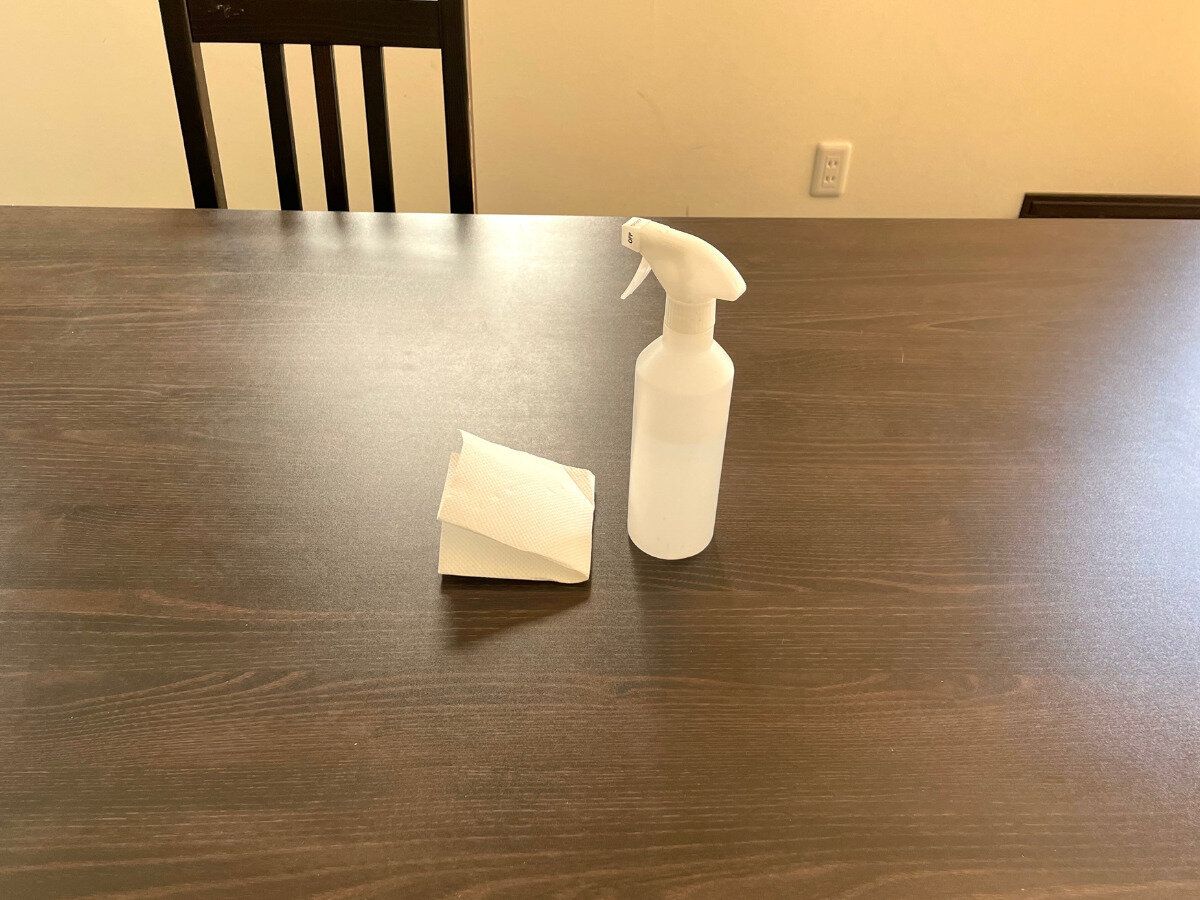 食事の後は、テーブルにアルコールスプレーをシュシュと吹きかけて、キッチンペーパーで拭きとります。