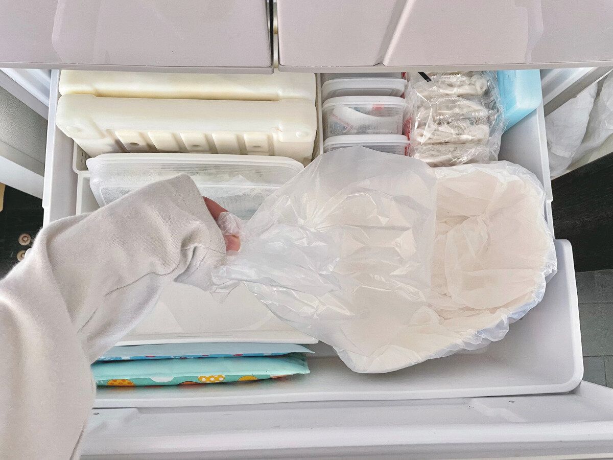 生ゴミなどは、ゴミ受けカゴに直接ためて、たまった生ごみはビニール袋に入れて冷凍庫へ。