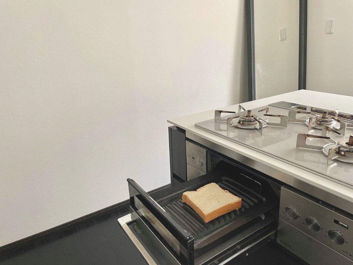オーブントースターの代わりにグリルでパンを焼けば、トースターにたまったパン粉の掃除いらず。