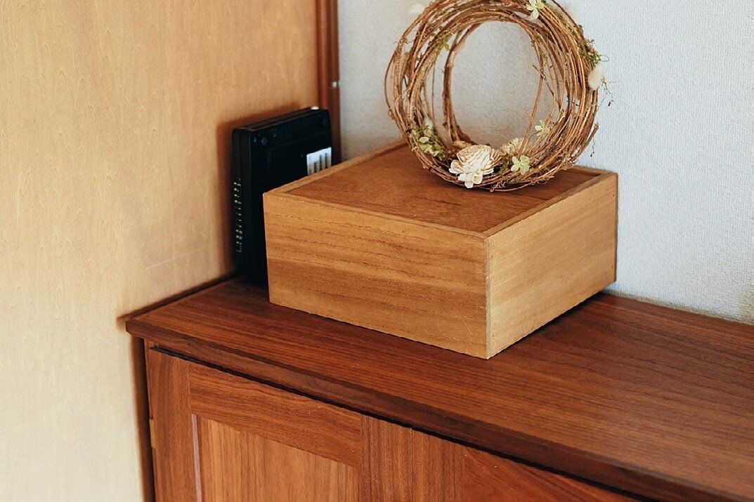 Wi-Fi、ポータブルTV、プロジェクターなどの配線が見えるとゴチャゴチャするし、ホコリがたまると掃除が大変だから、木箱で目隠し。木箱の上ならホコリがたまったとしてもサッとひと拭きですみます。
