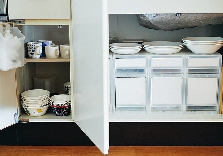 食器はサイズをそろえて重ねればシンク下に収まって、キッチン広々