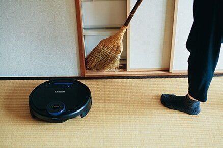 掃除ロボットのスイッチを入れながら隅っこのホコリをサッと掃くとキレイに