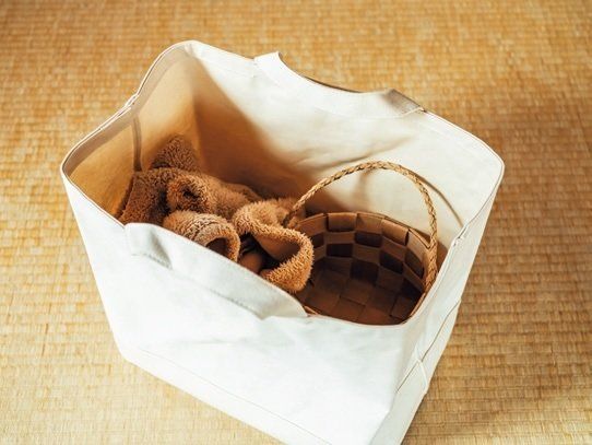 指定席が決まっていない物や寝室などに戻すのが面倒なときは、取りあえずボックスに。「折りたたみできるかごや袋などを用意しておけば、仮置きでき、床の散らかりを防げます」。