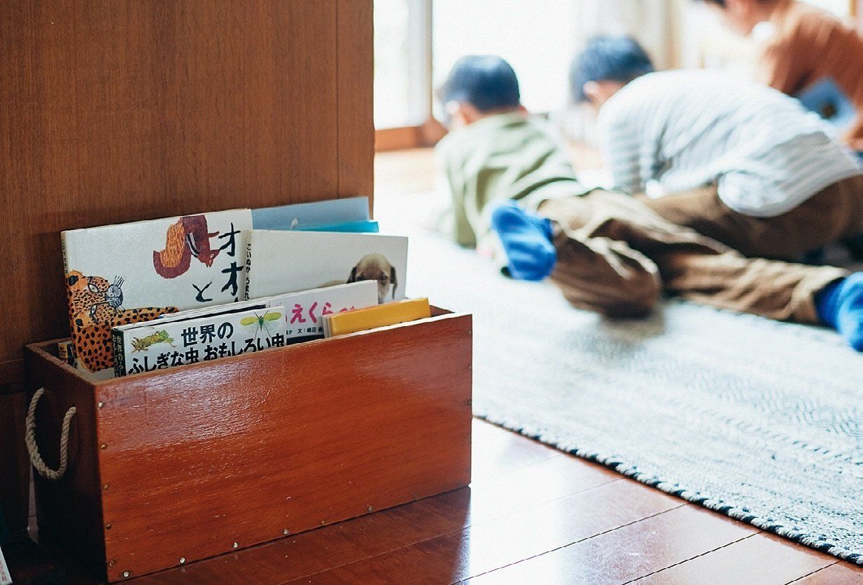 本と図書館が好きな山中家の子どもたち。「本棚に図書館の本を交ぜないよう、図書館本専用ボックスを部屋の隅に設置。寝ころんでも出し入れでき、本が散らかりません」。