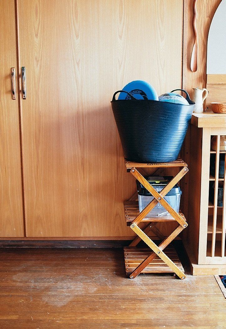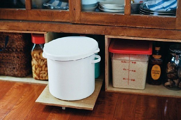 重たいから動かすのが面倒なうえ、日もちするみそやじゃがいもは、床置きしがちな食材の2大巨頭。そんな物こそ自作のキャスター台にのせ、移動しやすくすれば、使い勝手も◎。
