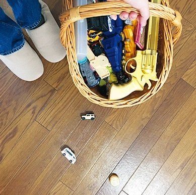 床に散らばったおもちゃを拾っておもちゃ箱まで運ぶのが面倒だったけど、カゴを持ちながら片づけて回るようにしたらすごくラク。片づけが面倒じゃなくなりました。