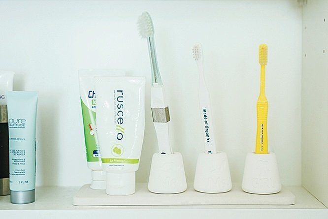 歯ブラシから滴る水は、ぬめりの原因に。小まめに洗ったり拭いたりしなくてすむように、吸湿性が高い珪藻土の歯ブラシ立てに(azuさん/『サンキュ!』18年10月号)