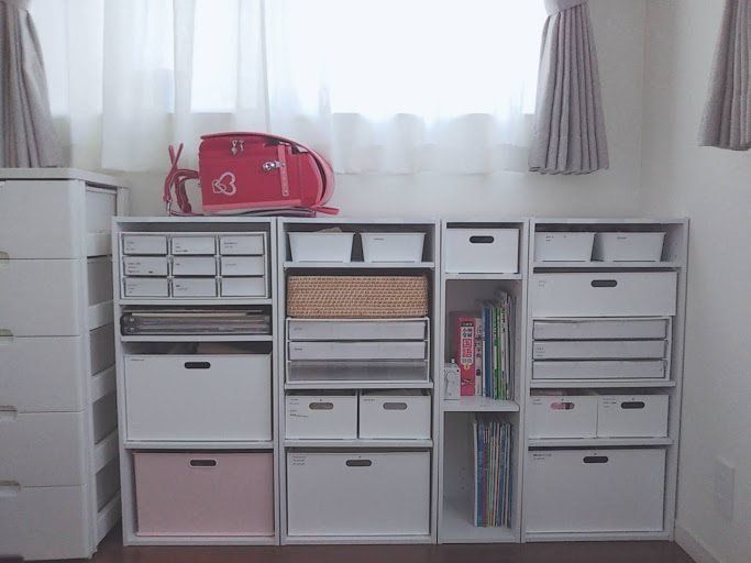散らかりがちな子どもの学用品やおもちゃなどは、サイズのバリエーションが豊富なニトリのカラーボックスを組み合わせて収納しているのだとか。インナーボックスを活用することで、ごちゃつき感のないすっきりしたスペースになっていますね。放置されがちなランドセルは「置くだけ」収納が一番片づいたそうです。