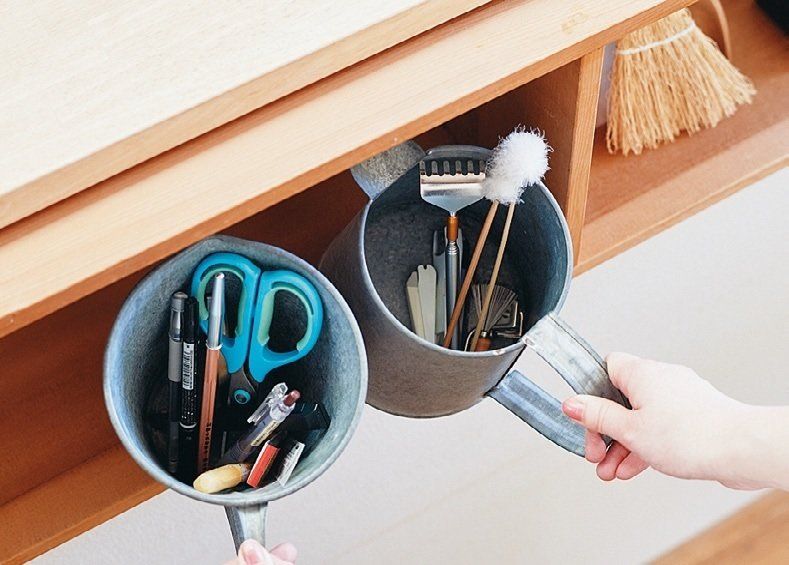 家族が通るリビングの動線上にリモコンやはさみ、つめ切りなどの収納グッズをスタンバイ。収納グッズはすべて口が広い物を選んでいるから、ポイッと投げ込むだけでOK。