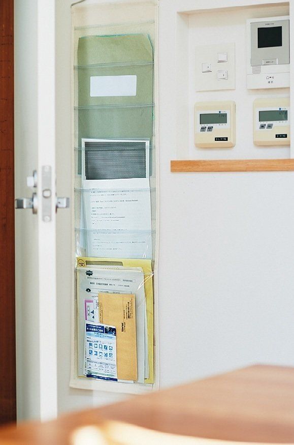 BOXやファイルだと埋もれたり放置したりしがちなので、重要なプリント類は透明の壁掛けホルダーにイン。「通りすがりに見るのを習慣にし、保管の必要がなくなったら処分します」。