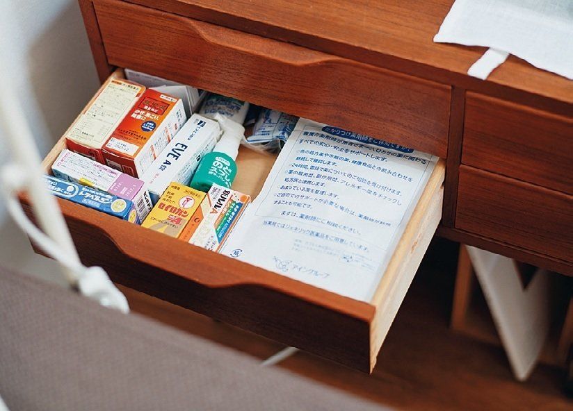 「薬は家族共通の物が多いから、ソファわきの棚1段分を薬専用にしています」。ほかにもパスポート専用、イヤホン専用と雑多な物は交ざらないように1段=1ジャンルごとに収納。