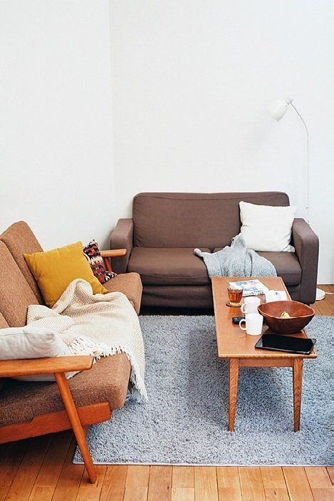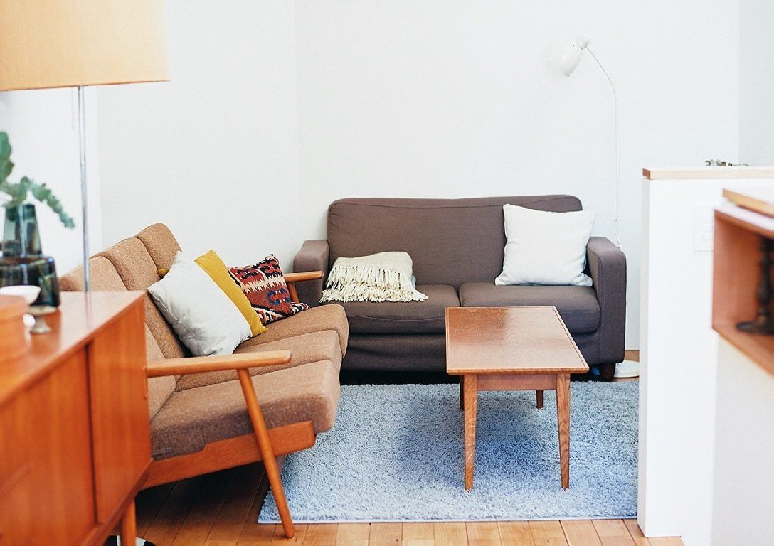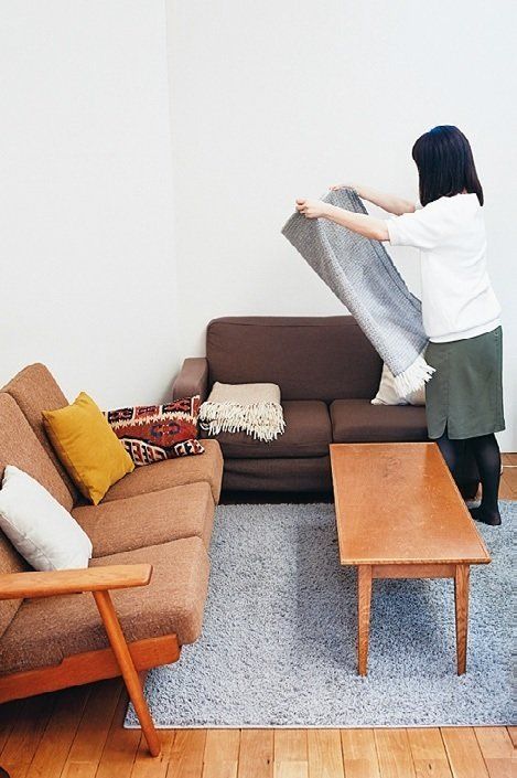 クッションはソファの背にぴったり立てて置く。ブランケットは四隅をきっちりそろえ、フリンジが手前に来るようにたたむ。パッと2分で終わります。