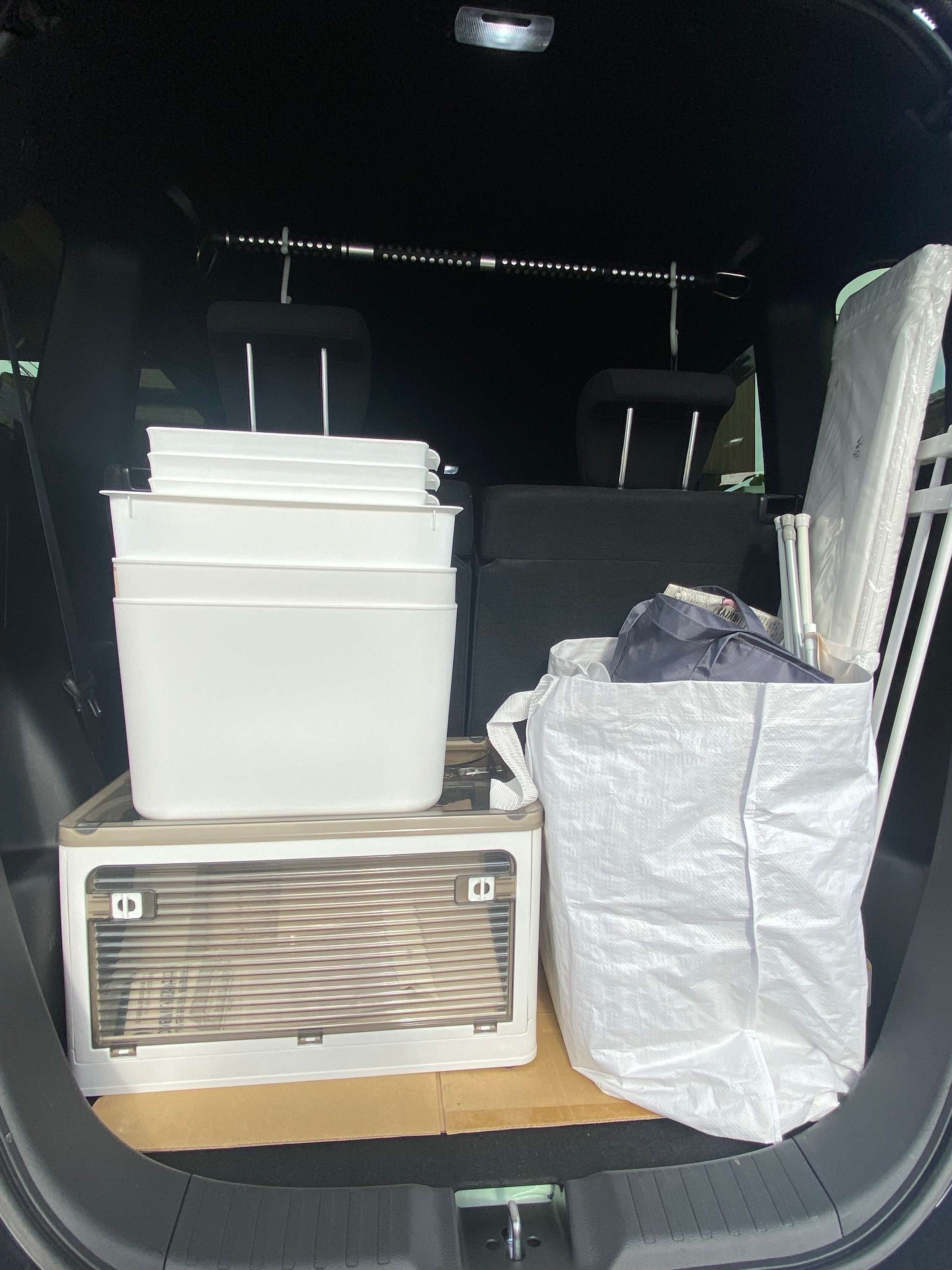 移動は100%車で、荷台には大量の収納グッズを、後部座席にはいつも使う道具やエプロン、ごみ袋など色んなものを常に車の中に入れているのだそう。