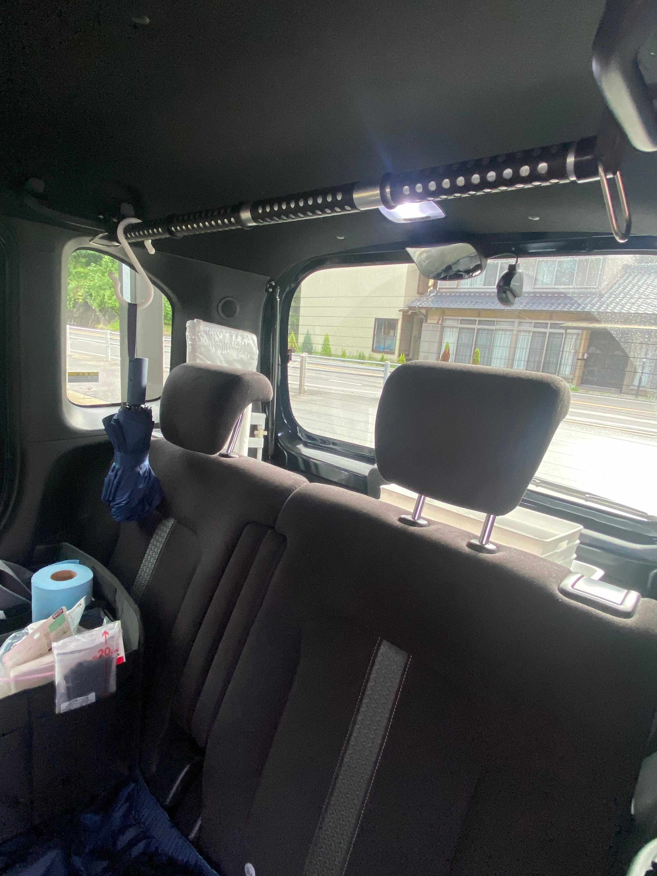 続いて後部座席。ここでは2つの収納グッズを使っています。座席には仕切りがあって使わないときは畳んでコンパクトになる収納ボックス。天井に近い部分にはバーを設置しています。吊るす収納が叶うので傘を一時的に引っ掛けたりひざ掛けを掛けたりとなかなか便利です。(掛けすぎは注意)