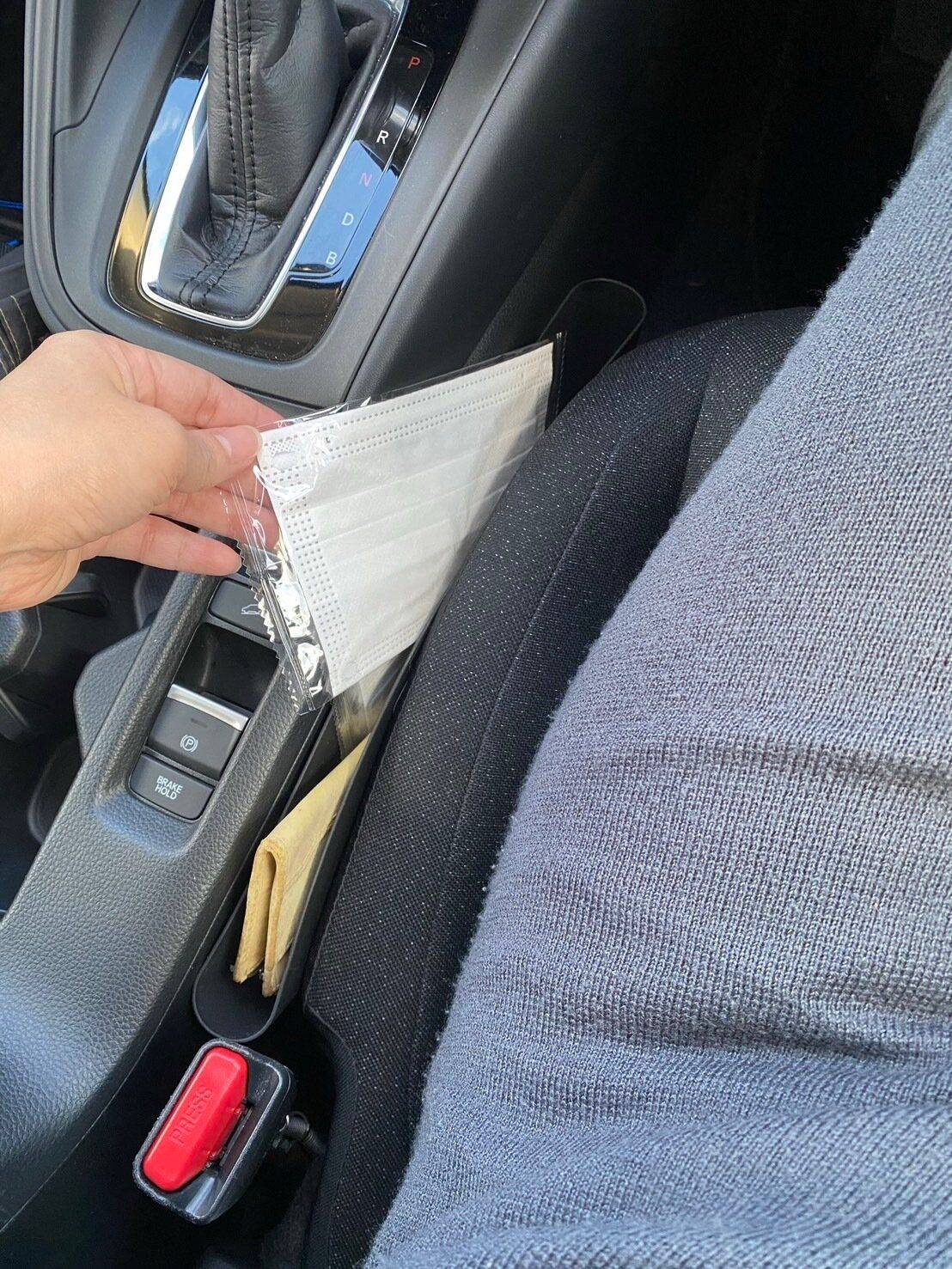 セリアのスリムポケットという商品です。細かいものがすき間に入ってしまうリスクも防いでくれるついでにマスクや駐車券などをサッと取り出せて便利です。