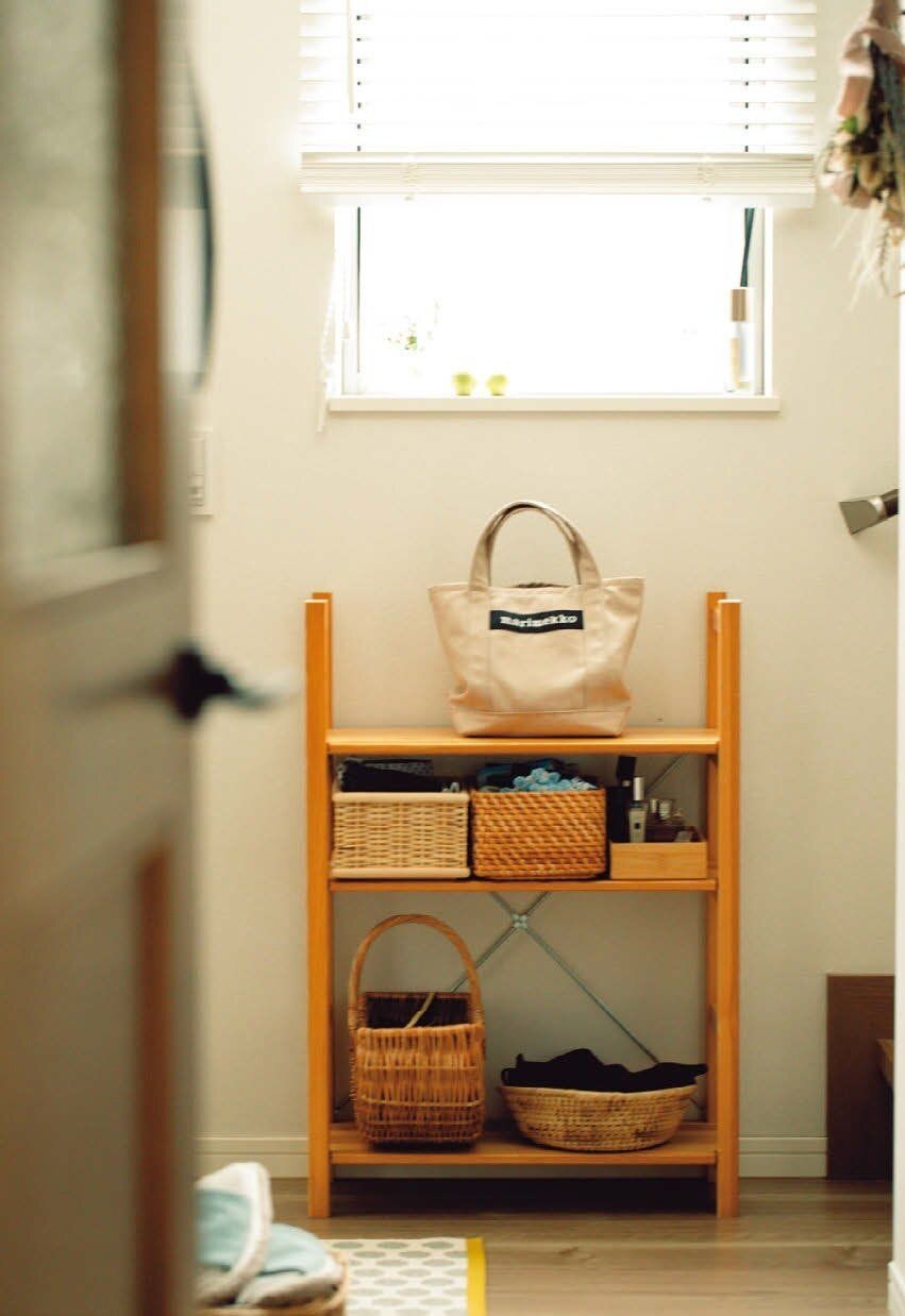 私は玄関で靴を脱ぐと、バッグも鍵も「ぽいぽ~い」と投げ出したくなる習性があるから、投げ出す場所に棚とカゴを設置。といってもなんも新しく買ってないで。家の中で余ってたカゴと棚で使える収納が完成したわ。