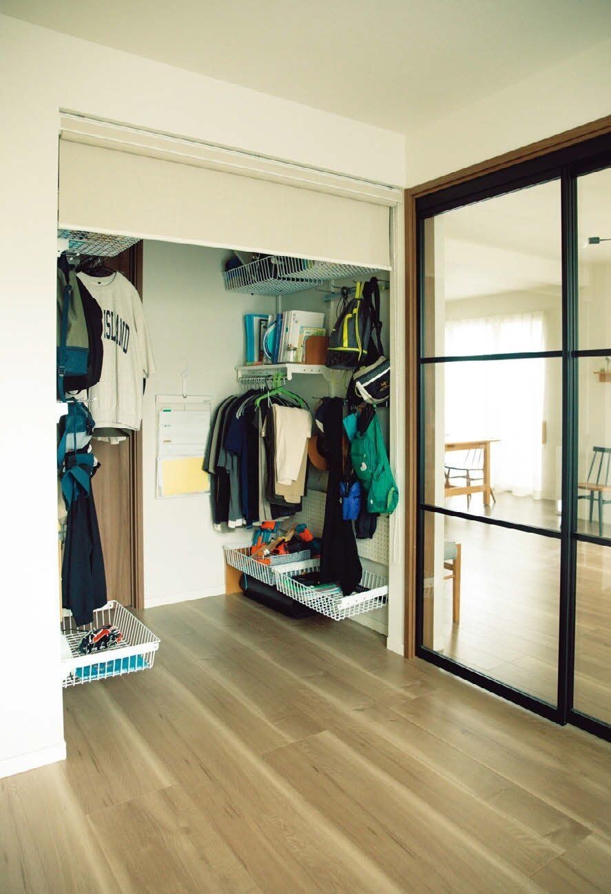 リビングからは死角で、布を下ろせば中が見えない、夫と子どもの洋服&学用品置き場。ここは男子に完全おまかせエリアで私は触らないから、収納はハンガー&カゴだけにして出しやすくしてます。“あえて見ない”のも大事!