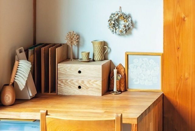 親も子も長く過ごすダイニング横の机にファイル立てを置き、小2の長男に紙類を入れてもらいます。連絡帳、宿題、提出物、学校書類の4つに分けて、不要な物はすぐ処分。