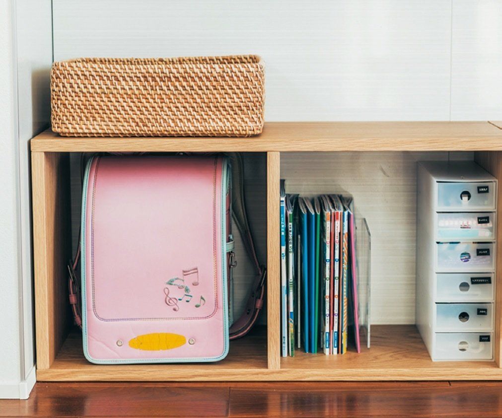 リビングの隅のランドセルコーナーの上にプリント類を入れるカゴを設置。これなら小学生の娘も入れ忘れません。宿題中に配布物に目を通して、保管する物はファイリング。提出物はすぐ記入して、その日のうちにカゴをからっぽに。