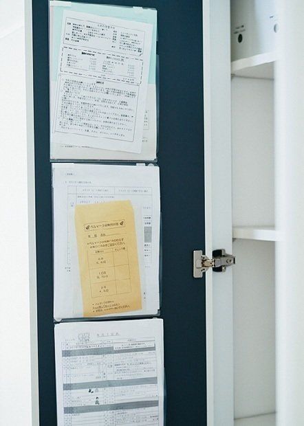 クリアーファイル3枚をきれいにはがせる両面テープでリビング収納の扉裏に貼って、人別に紙物を仕分け。扉を開けるとすぐ見られるから確認漏れもなし。あふれそうになったら確認済みや期限切れの物を処分。