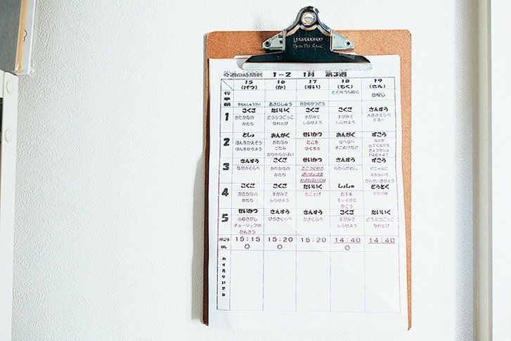 プリント類は届いた日に仕分けるのが習慣。時間割や行事のお知らせなど頻繁に見る物はバインダーにはさみ、それ以外はすぐに処分。翌週に必要な物の準備も兼ねて、金曜日に中身を整理します。