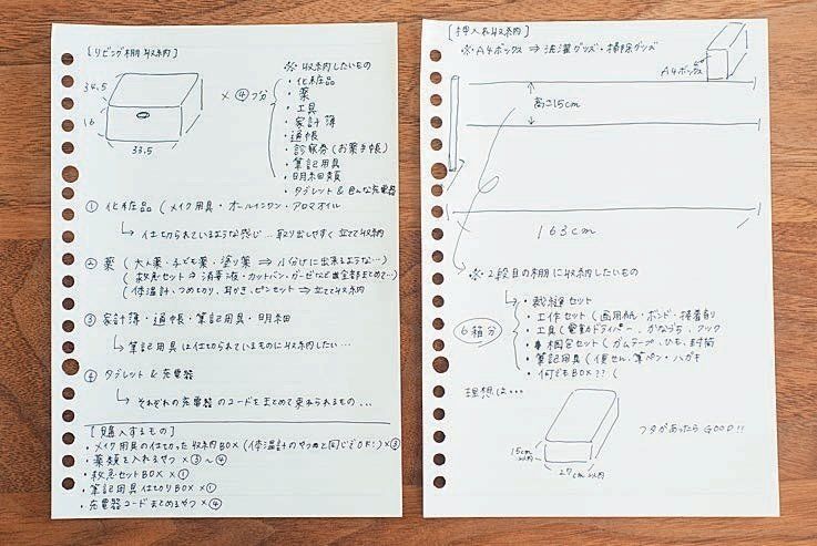 収納の場合、どこで何を入れるための物が何個必要かを綿密に考えて書き出します。このメモを見ながら買い物すれば失敗はなし。