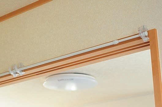 鴨居フックと突っ張り棒でリビングのちょっとしたスペースに物干しハンガーを自作。専用グッズがなくても組み合わせでいろんな物が作れる。