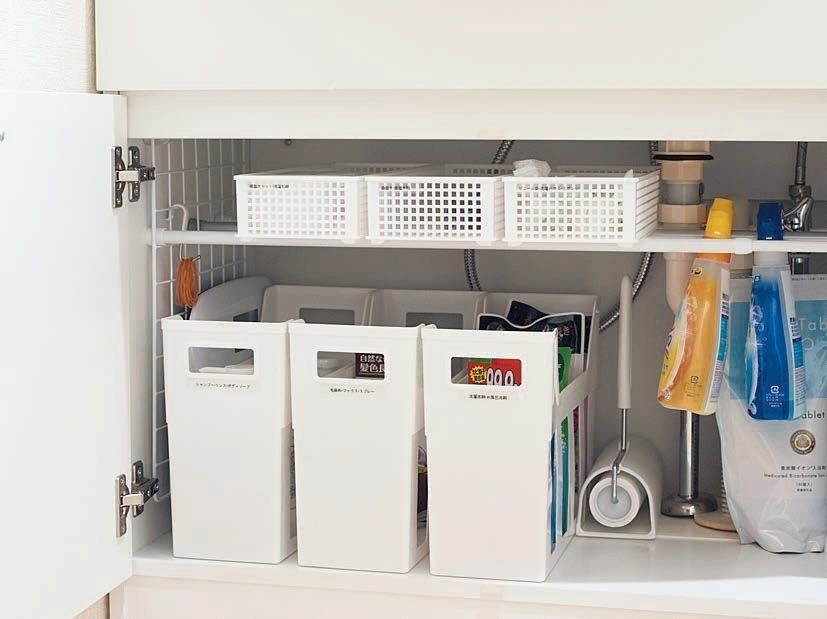 ごちゃつきがちな洗面台下の収納スペースではファイルボックスが大活躍。アイテムごとに収納しておき、なくなったら買いたすことで、ダブり買いを予防。取っ手がついているので、取り出しやすい。