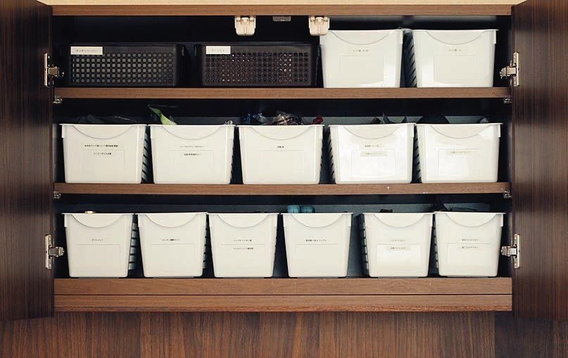 正確に採寸してサイズがぴったり合うボックスにしたことで、余白をつくらず使いやすい。1ジャンル1ボックスのルールにすれば、夫も迷わず物を取り出せるので、ストレスフリーに。