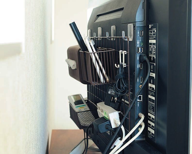 テレビ台をサッと掃除できるように考えた仕組みがこちら。テレビの裏にフックを貼り、ワイヤーネットをつるしてリモコン、スマホ、ティッシュ、充電器などをまとめて収納しています。