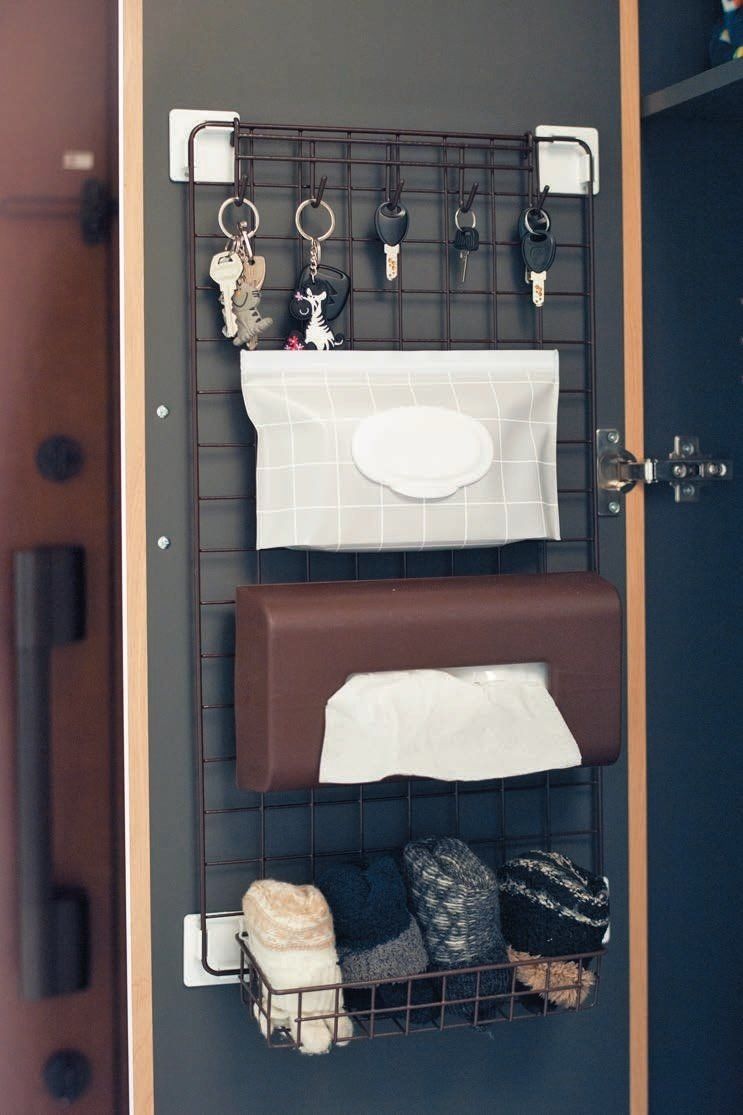 出かけるとき、靴をはいてから「あれを忘れた」と部屋に戻らなくてすむように考え自作した収納。鍵が行方不明になることもなくなりました。ティッシュは子どものはなをかむためにスタンバイ。