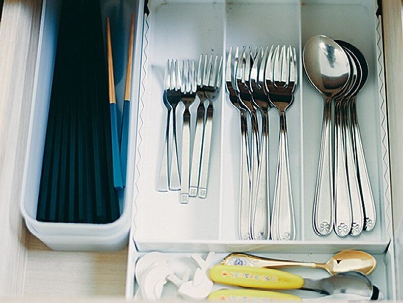 カトラリーや食器は、毎日使う家族の分+2~3組だけに厳選。「ゲストにはふだんの食器を使えばいいし、子どもの友達なら割り箸や紙皿で充分」。