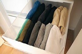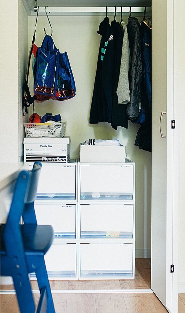 子ども服はシンプルで汚れにくい黒やグレーを厳選。「色みをそろえれば組み合わせやすく、少ない数でも着回せます」。引き出しを、夏、冬、ユニホームなどのイレギュラーに分け、ここに収まるだけ持つことに。