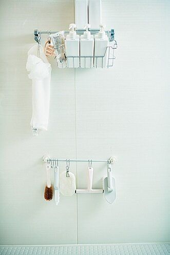 においやヌメリをもとから断つように、水まわりは吸盤やフックを活用して浮かせる収納が鉄則。水ぎれがよく、いつも清潔!