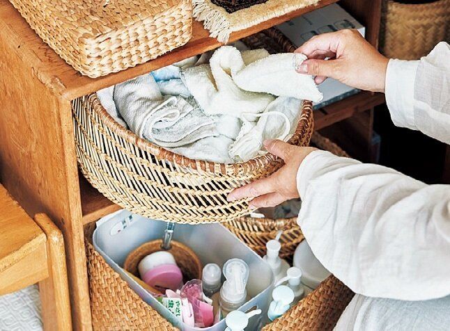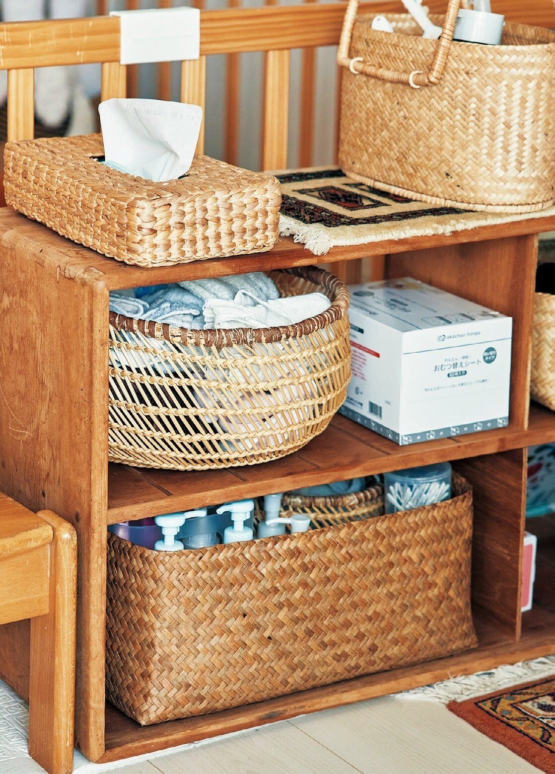 ミニタオルやスタイはシワになっても平気なので、たたまずかごにポイッ。「その方がラクだし、赤ちゃんのお世話グッズは棚一つにまとめておけばスッキリ見えます」。